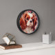 A close-up portrait of a blenheim Cavalier King Charles Spaniel puppy, rendered in a painterly style. The dog has a white and brown coat, with large, expressive brown eyes. It is surrounded by a profusion of pink and peach roses, creating a soft and romantic atmosphere. The dog's fur is depicted with meticulous detail, capturing the texture and flow of its long, silky hair. Perfect gift for cavie lovers.