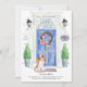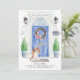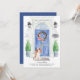 Announce your new address with our stylish announcement featuring a Cavalier King Charles Spaniel, blue front door, welcome mat, slate sign, topiaries and a floral wreath set on a gray brick background.