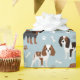 Cute Cavalier King Charles Spaniel with black, brown and white coats with scattered dog bones and pawprints pattern.