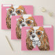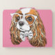 This design features a portrait of a Cavalier King Charles Spaniel wearing glasses and a bow tie on a pink background.