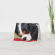 This is a blank note card featuring an original photograph of a beautiful tri-color Cavalier King Charles Spaniel, sleeping on his colorful, striped blanket.
