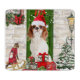 Cavalier King Dog sitting outside decorated home with Christmas wreath, Christmas tree is a perfect Christmas gift idea for dog lovers.