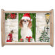 Cavalier King Dog sitting outside decorated home with Christmas wreath, Christmas tree is a perfect Christmas gift idea for dog lovers.