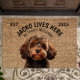 This welcome mat can be personalized with your dog’s name, the slogan can also be changed or you could use a picture of your own dog (make sure it's transparent). Text reads: Jacko Lives Here…. All treats welcome.
