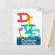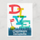 Colorful Cayman Islands Caribbean scuba design. Retro typography in inkpress style with the word "Dive", along with a scuba flag floating in the ocean.