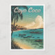 A vibrant and nostalgic depiction of Cayo Coco, Cuba, a tropical paradise known for its pristine white-sand beaches, turquoise waters, and lush mangroves. The design captures the idyllic beauty of the island, with its secluded shores, luxury resorts, and crystal-clear Caribbean Sea. Rendered in a vintage style, the artwork evokes the relaxing atmosphere and natural splendor of Cayo Coco, inviting viewers to explore its tranquil beaches, diverse wildlife, and vibrant marine life.