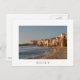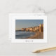 Postcard of the typical architecture of the old houses built on the beach of the Mediterranean Sea in the town of Cefalu, on the Island of Sicily in Italy with a white border and the text Sicily.