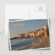 Postcard of the typical architecture of the old houses built on the beach of the Mediterranean Sea in the town of Cefalu, on the Island of Sicily in Italy with a white edge and the text 'Cefalù'. The card is a bit rotated to create the illusion of it laying loose .