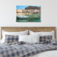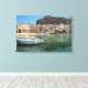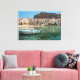 Canvas landscape print of two boats in the old small port of Cefalu, an old town with crooked houses on the waterfront and a small city beach on the north coast of Sicily, island in Italy. Great decoration on your wall!
