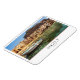 Photo souvenir magnet with two boats in the old small port of Cefalu, an old town with crooked houses on the waterfront and a small city beach on the north coast of Sicily, island in Italy with the text 'Sicily, Italy' in a white box and with stripes in green, white and red, the colors of the italian flag.