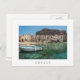 Postcard of two boats in the old small port of Cefalu, an old town with crooked houses on the waterfront and a small city beach on the north coast of Sicily, island in Italy with a white border and the text: 'Cefalù'.