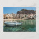 Postcard of two boats in the old small port of Cefalu, an old town with crooked houses on the waterfront and a small city beach on the north coast of Sicily, island in Italy.