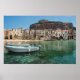 Poster print of two boats in the old small port of Cefalu, an old town with crooked houses on the waterfront and a small city beach on the north coast of Sicily, island in Italy. Great decoration on your wall!