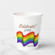 These PRIDE THEMED Paper Cups feature the LGBTQ flag. Above the flag the text reads "Celebrate!" and below that there's an area for custom text.