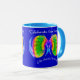 "Celebrate the beauty of the autistic spectrum" text with an abstract rainbow butterfly. Autistic pride mugs from autistart.com.