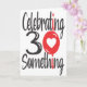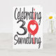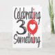 Birthday greeting card for a person turning 30 something. red and black letters and a heart. "Celebrating 30 Something"