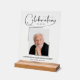 Modern memorial funeral acrylic sign (with or without wood block holder) features the wording 'Celebrating the Life of', your loved one's photo, their name, and their birth/death dates. MATCHING items in our collection.