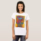 Vibrant Stylized painting of a colourful floral bouquet in a matching striped colourful vase by popular artist Lisa Lorenz on a stylish T-shirt.