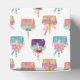 Whimsical pattern features small colorful cakes with icing and candles