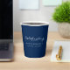 Personalize this simple minimal paper cup template on a classic blue background with the name and dates of your loved one. Classic design featuring simple black script typography on a clean white background. Perfect addition to your funeral memorial remembrance reception event. Easy to customize. Matching products available. Our heartfelt condolences on your loss.