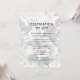 Elegant calla lily celebration of life invitation featuring a floral background of purple flowers, calla lilies, orchids and greenery.