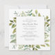 Elegant celebration of a life square invitation features a botanical frame of white berries and flowers and foliage. The deceased person's name is written in a traditional script text. All of the text can be easily edited to create a personal remembrance.