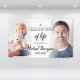 Elegant memorial banner with the message " a celebration of life, in honor of" and personalized with the name and years of the deceased. Customize it by adding a before and after photo of the person as a child on the left and a recent one on the right. Welcome sign for a memorial service or decor for a wake or funeral. To change the photo placement: click on the button to customize it further, click on "crop", and move the image.