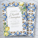 Composed of cursive script and serif typography on leafy greenery green foliage botanicals; All against a backdrop of white, yellow and blue mediterranean Spanish tiles with watercolor yellow lemons. This is a vintage celebration of life, funeral or memorial invitation.