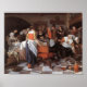 This painting is in the Wallace Collection in London. It shows a party to celebrate the arrival of a newborn baby. In the middle, a father holds his newborn. On the left, the mother lays in her bed (below the canopy on the top left). Friends and family surround the father and baby. The scene is chaotic but happy. People engage in all sorts of activities, and bowls, pans, plates, egg shells, and food are scattered throughout the room. In the foreground, a maid is shown from the back. She is dressed in happy colors and holds a red chair for the father to sit in. The woman standing on the right side (from our point of view) from the father will receive some money from the father who puts his left hand in a money bag. In the right foreground, a smiling woman is stirring in a large pot and holds up her hand to receive some money as well. Another woman helps her pouring sugar into the pot. The maid on the right is getting a sausage that hangs from the chimney. On the left, two people are paying attention to the mother, and one of them feeds her some soup. To the left of the table, a pregnant woman sits next to a crib. She holds a glass in her left hand and conceals her belly with a white apron.