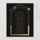 Celestial Black Gold Bilingual Spanish Quinceañera Invitations features an elegant gold sun, moon and stars with a golden frame on a black background. Inside is your custom Quinceañera invitation information in English. On the reverse is the invitation in Spanish. Personalize by editing the text in the text boxes. Designed for you by Evco Studio www.zazzle.com/store/evcostudio