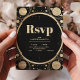The RSVP details are presented in a combination of modern calligraphy and classic serif fonts, embossed in luxurious gold foil to match the celestial elements. The card offers a clear and organized layout for guests to respond, with options for accepting or declining the invitation, along with space for any dietary preferences or special requests.