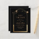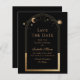 Celestial Black Save The Date Birthday Quinceanera Invitation features a gold sun, moon and stars frame on a black background. Inside is your custom Quinceanera save the date information. Personalize by editing the text in the text boxes. Designed for you by ©2024 Evco Studio www.zazzle.com/store/evcostudio
