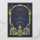 Capture the enchantment of a night sky with this midnight blue wedding invitation, adorned with twinkling gold foil stars and elegant Victorian-inspired motifs. The deep blue backdrop sets a majestic stage for the shimmering gold details, reminiscent of a Victorian tapestry. This design conjures up the magic of a starlit evening, with ornate columns and graceful flourishes adding a noble touch. Crafted for couples seeking a blend of old-world charm and celestial romance, this invitation is a gateway to a wedding event wrapped in splendor and timeless elegance.