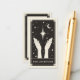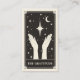 This Boho wedding thank you card features a tarot card style design in a black and cream colour palette. The illustration shows two hands in a gesture of gratitude. The background has a moon and twinkling stars. This would be perfect for anybody having a Celestial, magical or Star themed wedding or for somebody with a witchy aesthetic going for a palmistry or fortune telling theme. The reverse side can be left blank for a handwritten message.