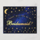 It has golden yellow text on navy blue sky background, with faux gold stars and moon. The word Bridesmaid on the front (that is in faux gold foil) and the message on the back are written in an elegant calligraphic script, the arched text "[Name] will you be my" above the word Bridesmaid in small caps.