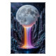 A visionary ceramic high-relief artwork portraying an ethereal alien nightscape. A colossal moon with opalescent, pearlescent, and subtle crackle glazes dominates a deep indigo and purple sky flecked with crystaline star-like details. From beneath the moon flows a radiant waterfall of molten rainbow glazes—pinks, yellows, cyans, and purples—cascading between jagged, crystaline cliffs glazed in deep teals, blues, and amethyst. The luminous flow collects in a reflective obsidian-black basin, mirroring both celestial light and vivid colors. The piece blends fantastical geology and futuristic elegance, showcasing masterful glaze control and sculptural detail that evoke mystery, serenity, and awe.