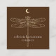 Modern square business card features gold celestial dragonfly with crescent moon illustration on dark brown background with white contemporary text on front, and gray text with customizable QR code for your website or social media on back.