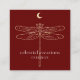 Modern square business card features gold celestial dragonfly with crescent moon illustration on dark red background with white contemporary text on front, and gray text with customizable QR code for your website or social media on back.