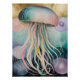 This artwork features a mesmerizing jellyfish, its bell rendered in a soft spectrum of pastel pinks, blues, and purples, with delicate, luminous striations. Its long, flowing tentacles trail downwards in a cascade of similar colors, creating a sense of graceful, undulating movement. The background is a dreamlike, abstract space filled with floating, orb-like shapes in muted shades of gold, lavender, and pink, suggesting a mystical underwater or even cosmic environment. The piece blends a sense of biological realism with a surreal, ethereal atmosphere, evoking the wonder and mystery of deep-sea life.