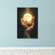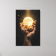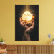 Step into a world of magic and tranquility with "Celestial Embrace," a premium giclée-wrapped stretched canvas print. This captivating art design depicts a woman's hands gently holding a brilliant full moon, a scene that evokes a sense of peace, wonder, and connection to nature. The moon's warm, golden-yellow light softly illuminates a delicate frame of light orange-pink flowers, creating a stunning visual contrast against a deep black, star-filled night sky.