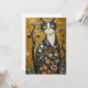 This image features a stunning cat rendered in the artistic style reminiscent of Gustav Klimt. The cat, with its striking yellow eyes, white and black fur, and intricate, swirling patterns on its body, exudes a regal and mysterious aura. The background is richly detailed with golden hues, organic shapes, and floral motifs, blending seamlessly into the cat's figure, which is adorned with ornate circular patterns and delicate embellishments. The overall effect is a mesmerizing fusion of natural beauty and luxurious, ornamental design.