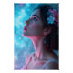 Dramatic, highly detailed portrait of a woman gazing sharply upwards toward cosmic heavens. Her face is almost full right profile, with one eye subtly visible. Intense celestial light in bright cyan and deep magenta illuminates her features and sparkling floral hair adornments. Dynamic, ethereal, and visually striking.