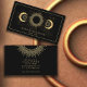 A celestial ethereal yoga instructor business card featuring a modern gold sun mandala with sun rays, and phases of the moon, with a pretty, modern script signature type. Faux gold foil effect.