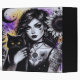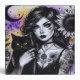 At the center of this otherworldly scene is a captivating gothic witch, whose striking black and white makeup enhances her powerful presence. Her skin is adorned with delicate flower and heart tattoos, each detail hinting at mystery, self-expression, and spiritual strength. She cradles a beautiful black cat in her arms—an iconic familiar, calm and wise, watching over your thoughts and secrets with quiet intensity.