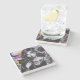 Bring a touch of celestial enchantment to your tabletop with this stunning stone coaster from the Celestial Gothic Witch and Black Cat Suite. The design captures a dreamy sky of purple, pink, yellow, and white, blending together like a cosmic sunset caught in motion. A striking black crescent moon hovers above, surrounded by soft stars that add shimmer and mystery. Framing the scene are black and white sunflowers, adding a bold, gothic floral edge to the otherwise ethereal backdrop.