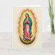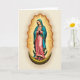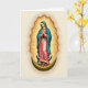 This card features a sacred female figure centered against a soft, neutral background, rendered with gentle shading that gives her a calm, tender presence. She wears a flowing soft pink gown with a teal-blue mantle sprinkled with tiny golden stars, and the careful folds of the fabric add a quiet sense of closeness and care. Her hands are clasped in prayer and her eyes tilt downward, creating an intimate, thoughtful look that reads like affection and steady support. Behind her, a golden oval halo of rippling rays spreads outward, bathing the scene in warm light and drawing your gaze to her face. Near the top, a short Easter greeting appears in small, gold lettering, set neatly above the halo, and a second line of text sits lower in a matching tone. She stands on a dark crescent shape that curves like a cradle beneath her, adding depth and contrast to the pastel clothing. A small cluster of pink blossoms rests at her feet like a gentle offering 🌷🐇.