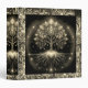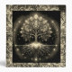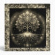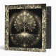 A beautiful ornate design with a gold tree of life with an ornate frame and a heart at the roots. There is a night sky background.