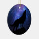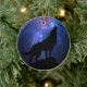 This stylish ornament is perfect for wolf lovers. Howling at the moon, the wolf stands on the edge of a rock, calling into the night. Black silhouette graphic with a celestial sky background.