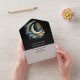 A beautiful all-in-one celestial moon invitation featuring crescent and full moons framed by clowds and glowing stars in a midnight black sky. The graphics appear to glow and shine in shades of blue, emerald green and a pale golden hue. These mystical generative content graphics are ideal for a starry night, moon and stars, over the moon, sailor moon, galaxy or celestial theme wedding or special event. The bottom third has a tear off response card with personalized rsvp address for your guests to complete.