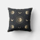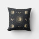 Elegant moon phase and celestial pattern throw pillow featuring crescent moons, stars, and radiant lunar details on a dark background. Ideal for astrology lovers, moon enthusiasts, spiritual seekers, stargazers, and fans of mystical celestial style.